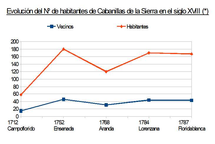 (*) Los Censos/Catastros de Aranda (1768) y Floridablanca (1787) no contienen el número de vecinos, mientras que los de Campoflorido (1712) y Lorenzana (1784) no tienen el de habitantes. Sólo el de Ensenada (1752) aporta ambos datos con una equivalencia de 3,865198 habitantes por cada vecino. Esta equivalencia, redondeando el resultado, es la que hemos utilizado para calcular los números faltantes de los otros censos.