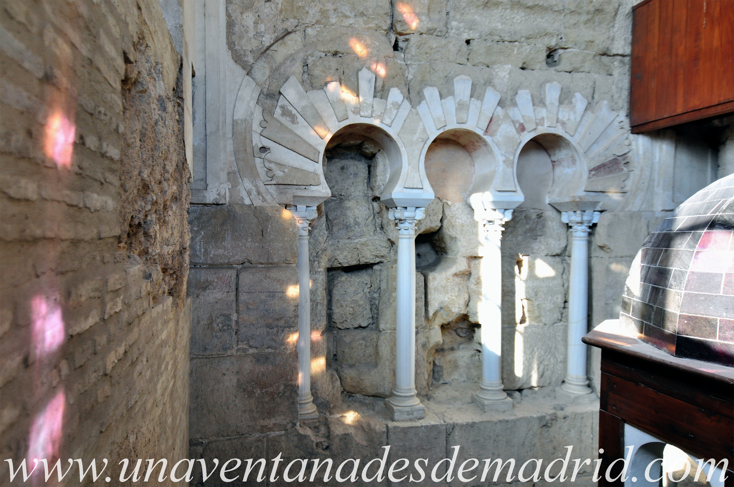 Tras cruzar ambos, vemos, a la izquierda y dispuestos en perpendicular a los de la entrada, otros dos arcos de igual factura, aunque sin decoración; a la derecha, hay un tercero, también sin decoración y ciego; y al frente, pudo haber otros dos, paralelos a los de la entrada, que debieron de desaparecer durante la reforma del siglo XVII (en 1659), al cubrirse el antiguo alminar.