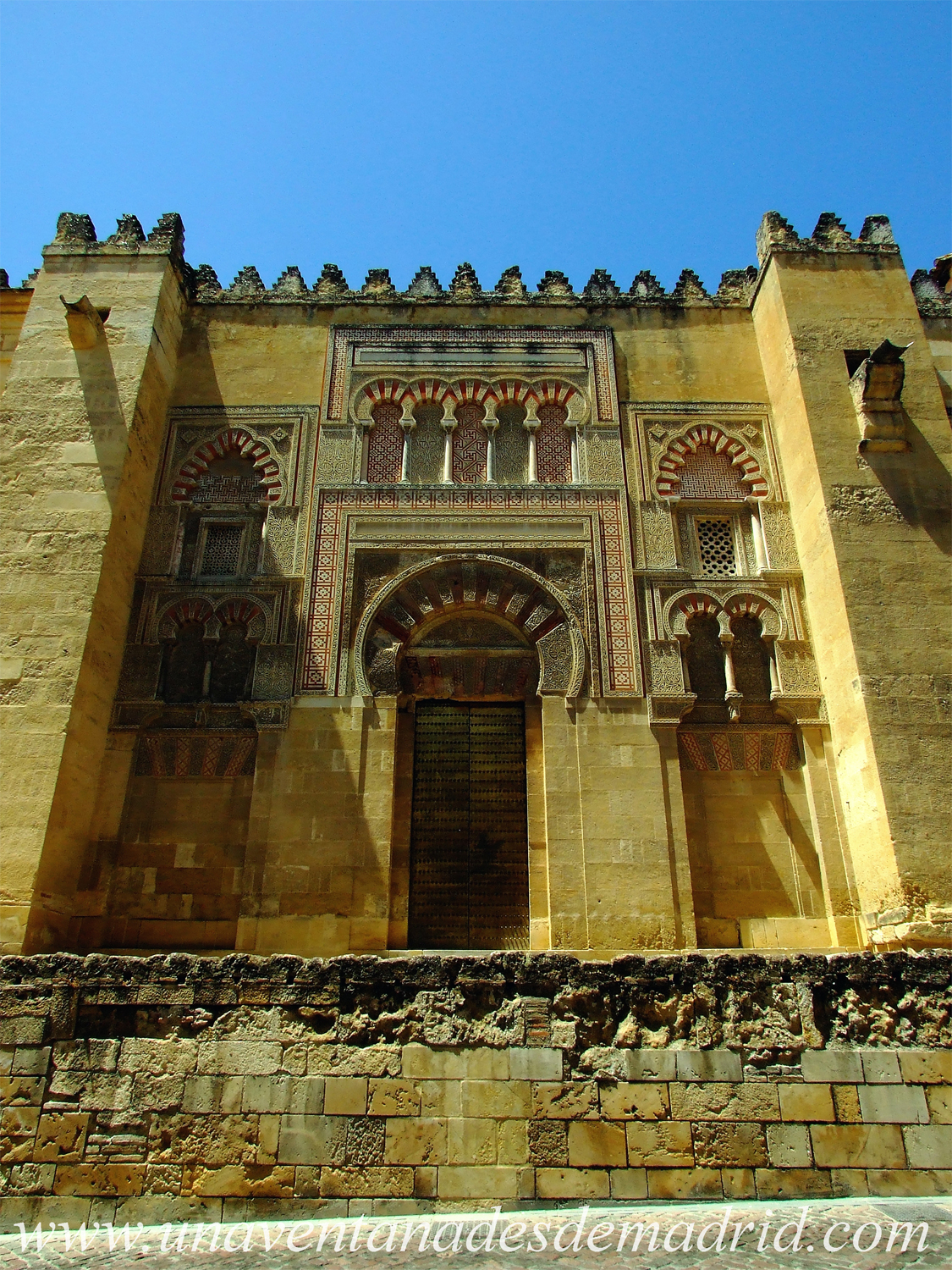 En esta página, haremos un recorrido por la parte exterior de la Catedral-Mezquita, es decir, iremos viendo una a una todas las puertas que componen cada uno de los cuatro muros que cierran el conjunto religioso, así como algunos otros elementos de interés que hay adosados a ellos. Este recinto, realizado en piedra caliza y rematado por almenas19 escalonadas de tipo sirio, cuenta con un total de 20 puertas, varias reconstruidas y restauradas ya en época moderna; mientras que algunas de ellas sirven de acceso al Patio de los Naranjos, gran parte del resto fueron tapiadas durante el siglo XIII, usándose como fondo de las capillas cristianas.