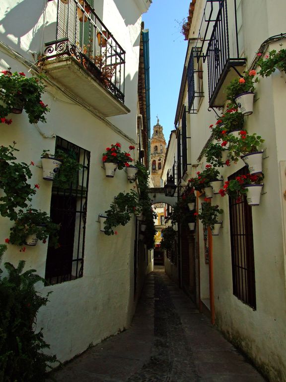 Una de las estampas más bellas que se puede contemplar en Córdoba es la de la torre de la Catedral desde la plaza en la que desemboca la Calleja de las Flores. De formas sinuosas y tan estrecha que es imposible extender del todo los brazos, esta pequeña calle es un azucaque7 cuyo trazado corresponde a un origen hispanomusulmán. Nuestro interés por incluirla aquí es el hecho de que, a mediados del siglo XX, el arquitecto Víctor Escribano recibió el encargo por parte del entonces alcalde Don Alfonso Cruz Conde de remodelar aquella calleja. Escribano cambió el antiguo pavimento por el empedrado de guijarros que hoy vemos, añadió unas placas de granito junto a los muros como si fueran aceras e incluyó los arquillos de medio punto que unen una pared con otra. En los años 60, se integraron en la plaza algunos restos arqueológicos y se colocó la fuente que hay actualmente y que, con el brotar del agua, hacen de este espacio un remanso de paz en el que sentarse a descansar antes de continuar recorriendo Córdoba mientras se contemplan las flores que inundan las paredes que nos rodean y, al fondo, la preciosa torre catedralicia.