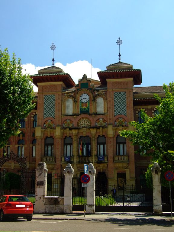 El edificio, de claro estilo neomudéjar, como ya mencionábamos antes, está compuesto de tres plantas. Podemos ver dos grandes rotondas laterales, mientras que la portada, formada por tres puertas de acceso, se encuentra ubicada en el centro del conjunto. Sobre ella, hay cinco balcones de piedra que dejan pasar la luz al salón de actos.