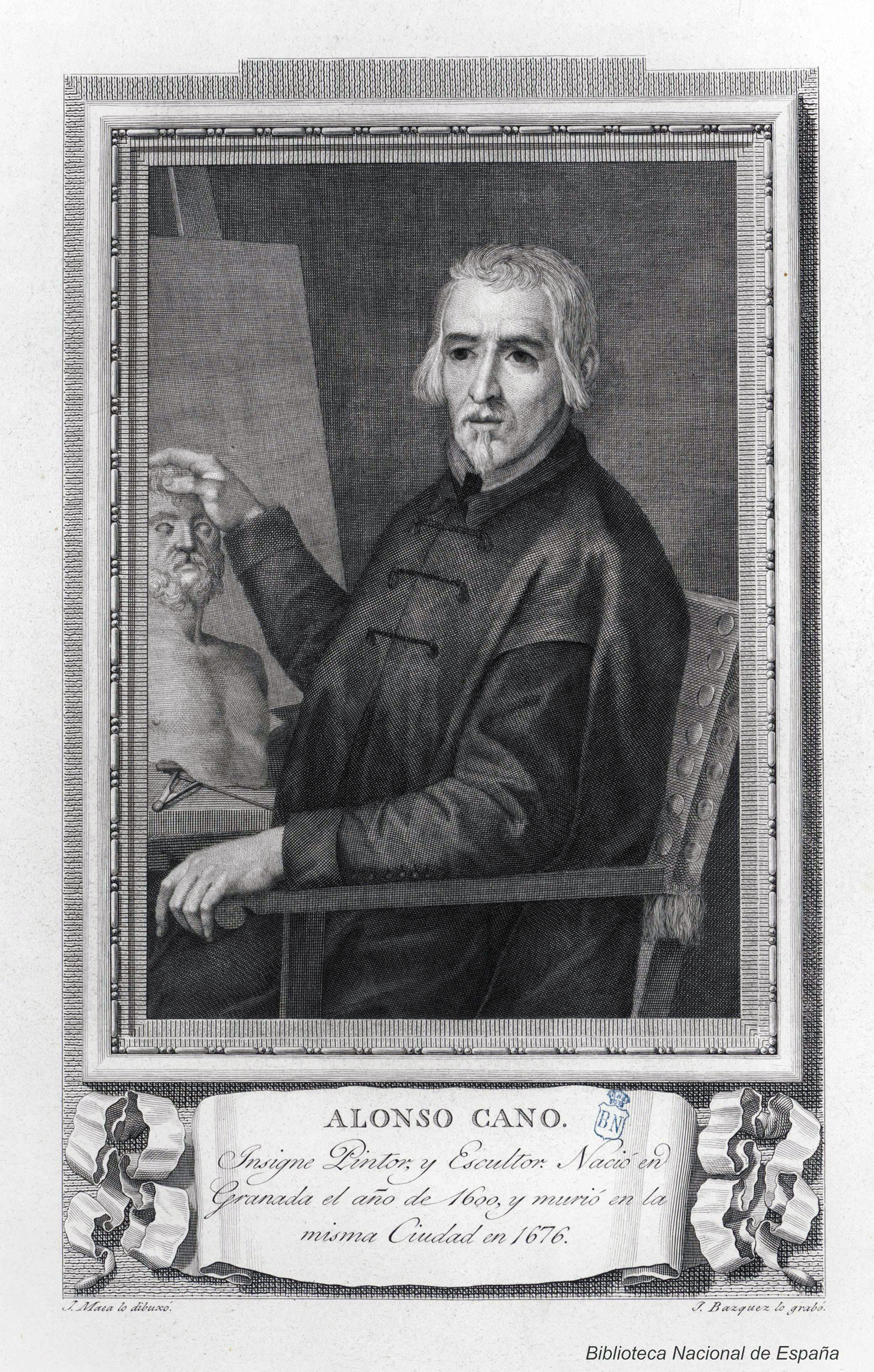 Retrato de Alonso Cano (1601-1667) dibujado por José Maea (1760-1826) y grabado por José Vázquez (1768-1804). Biblioteca Nacional de España.