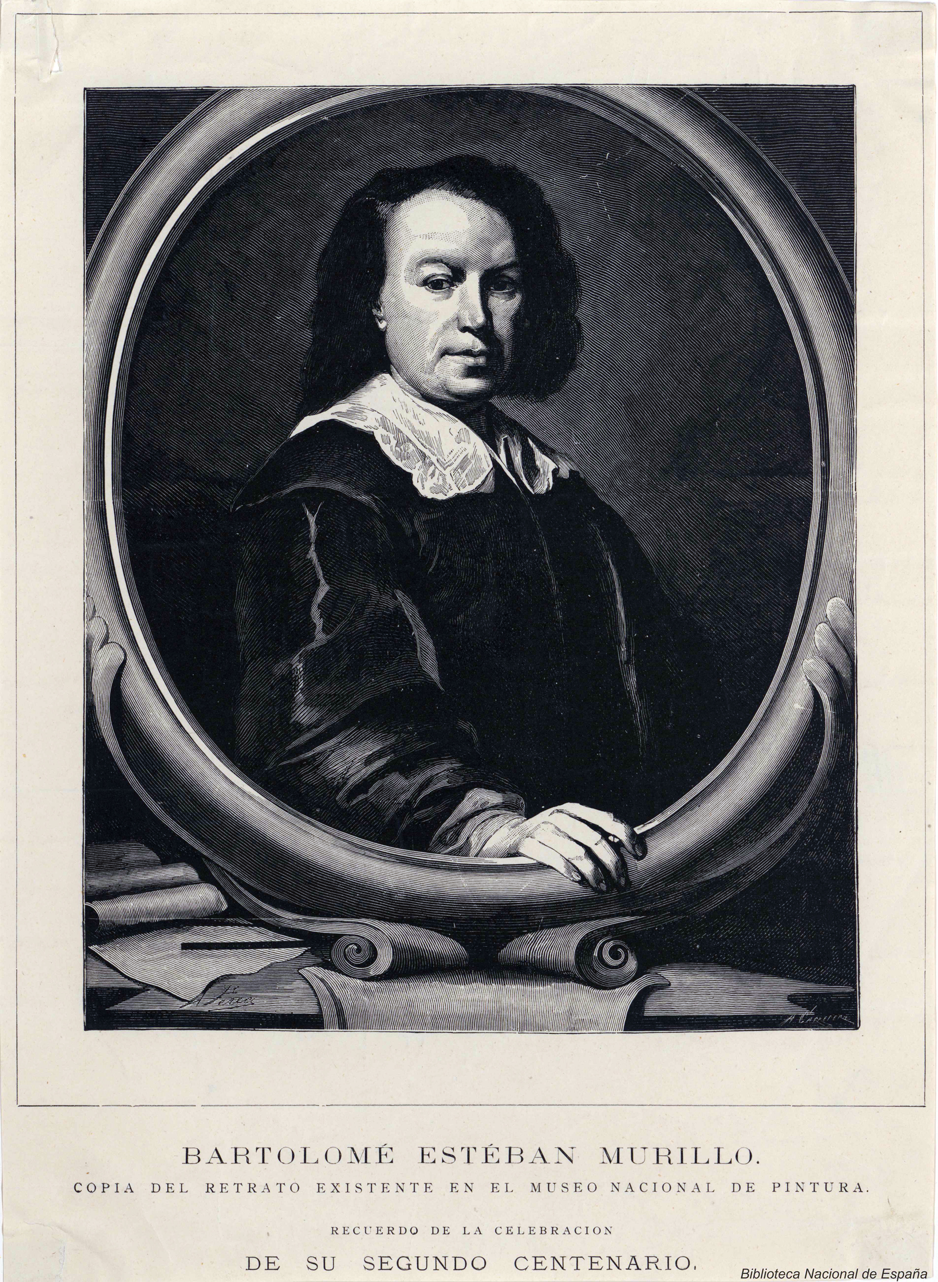 Grabado, obra de Arturo Carretero (1852-1903) y Alfredo Perea (1839-1895), de la copia de un autoretrato de Bartolomé Esteban Murillo (1617-1682) pintada por Alonso Miguel de Tovar (1678-1752). Biblioteca Nacional de España.