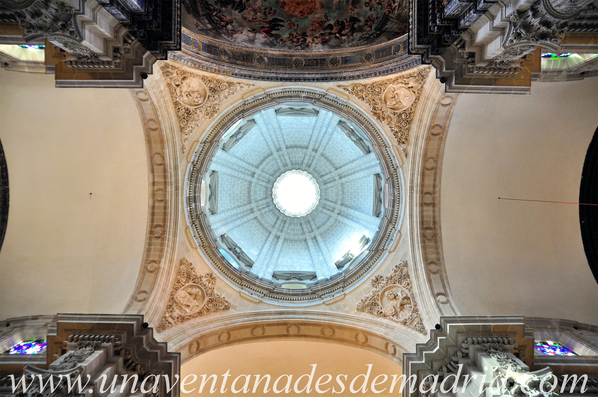 La nave central y el presbiterio tienen bóveda de medio cañón29 –con falsos lunetos30 en la primera y reales en la segunda–, mientras que las laterales las tienen de arista31. En los dos tramos situados más cerca del presbiterio, hay un falso crucero en el que se levanta una cúpula semicircular sobre pechinas32 con una ventana rectangular en cada lateral. El calificativo de falso es porque carece de los brazos laterales del crucero, aunque el espacio lateral entre pechinas, donde comenzarían ambos brazos, queda remarcado por sendas pinturas semicirculares. Precisamente en este espacio, al quitar las pinturas durante una restauración finalizada en 2015, aparecieron unos pequeños arquillos de su pasado como sinagoga.