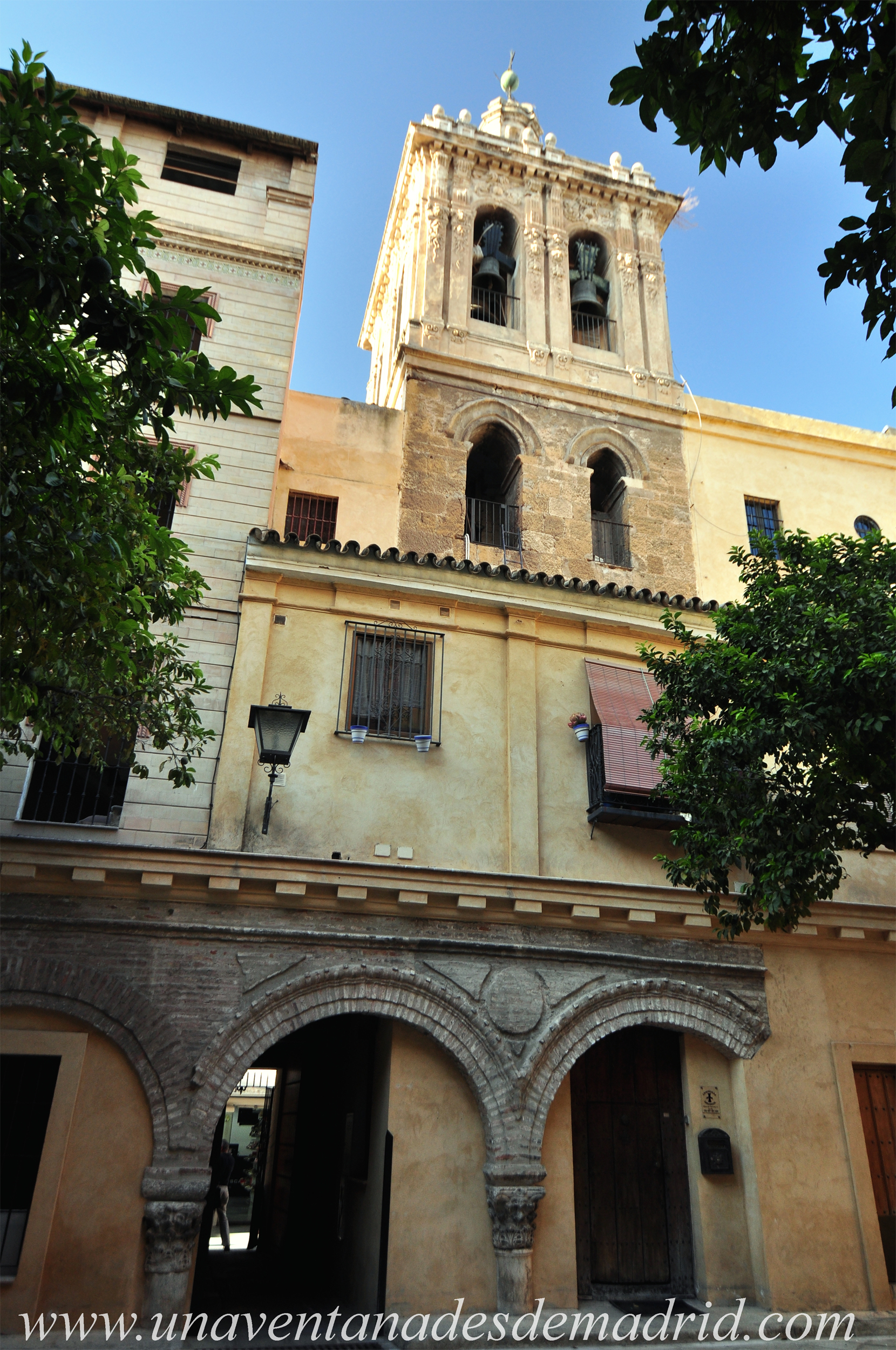 Torre campanario de la Iglesia del Divino Salvador fotografiada desde el Patio de los Naranjos del Salvador.