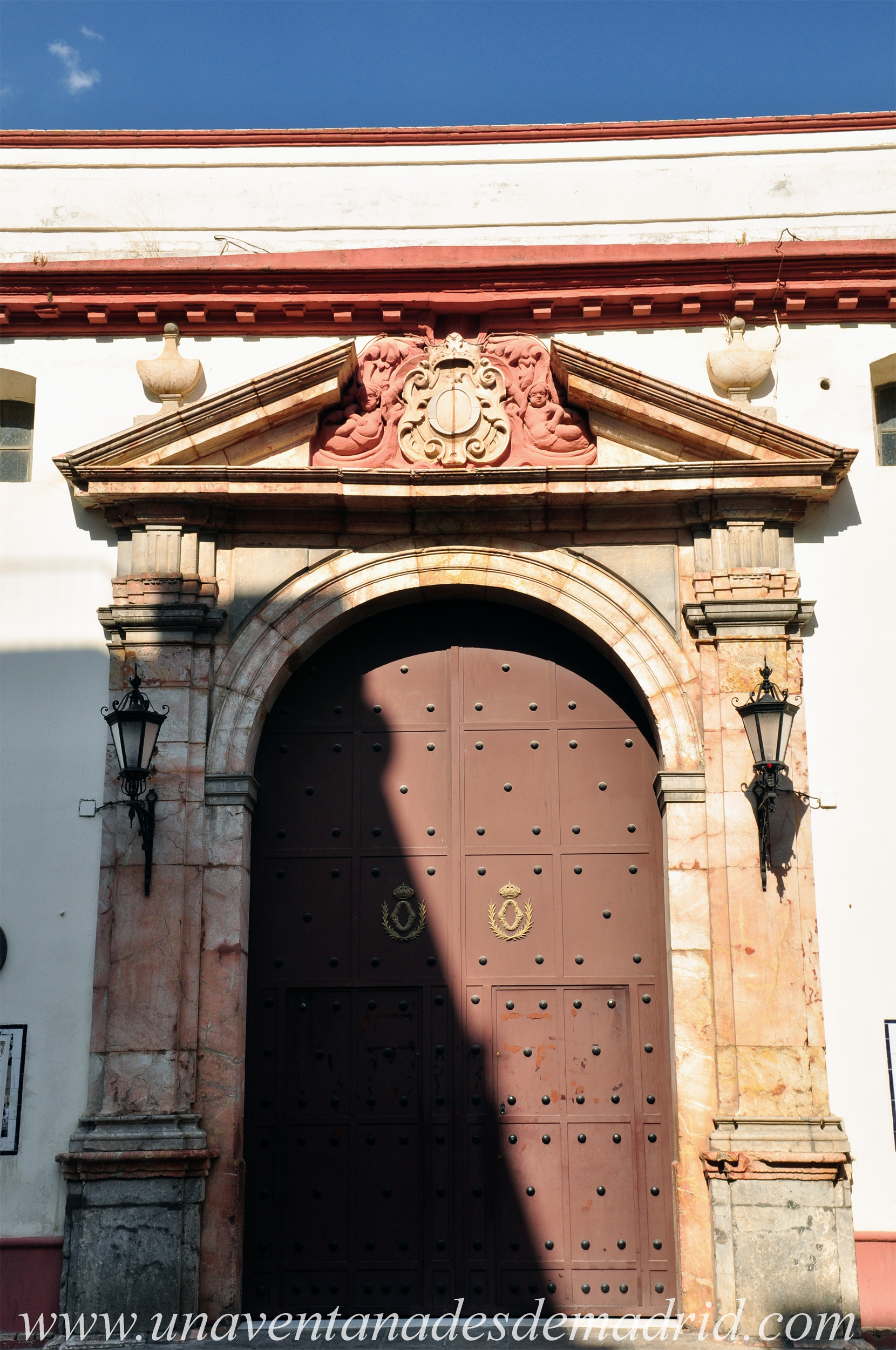 La portada principal, la de la calle Santa María la Blanca, está formada por un arco apuntado35, doblado y abocinado36 con la rosca38 adornada con una decoración de puntas de diamante39 realizada en piedra. Por encima de él, y bajo la imposta40 que lo separa del piso superior, se encuentra la inscripción: