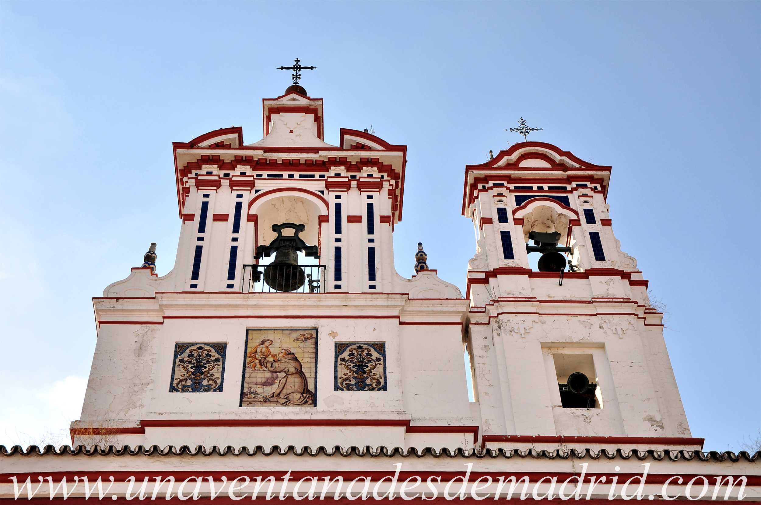 Sobre el lateral derecho de la nave central, el que da a la calle San Vicente, podemos ver dos espadañas del antiguo convento, en las que destaca, por su mayor tamaño, la situada más hacia los pies de la iglesia (hacia nuestra izquierda, según las miramos desde la calle San Vicente). Ésta es una espadaña del siglo XVII que está decorada con tres paños de azulejos de los siglos XVIII (o XVII, según la fuente a consultar), entre los que sobresale el central, con la imagen de San Antonio mientras recibe al Niño Jesús.