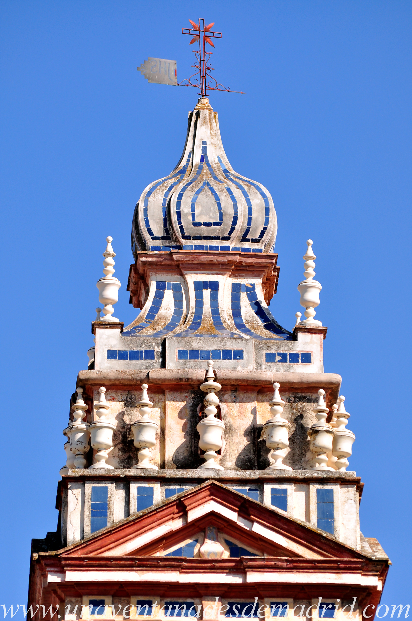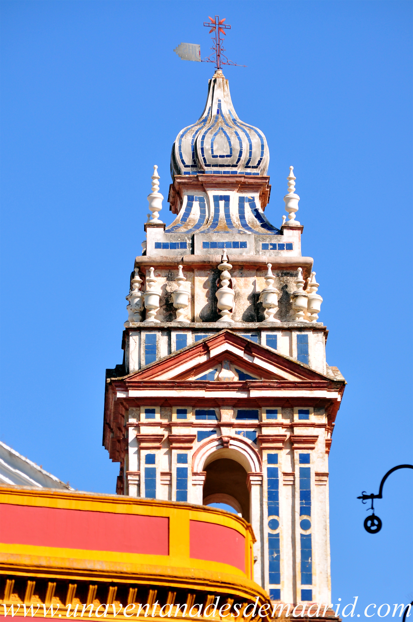 Es de destacar, igualmente, la cerámica policromada en blanco y azul que cubre el chapitel.