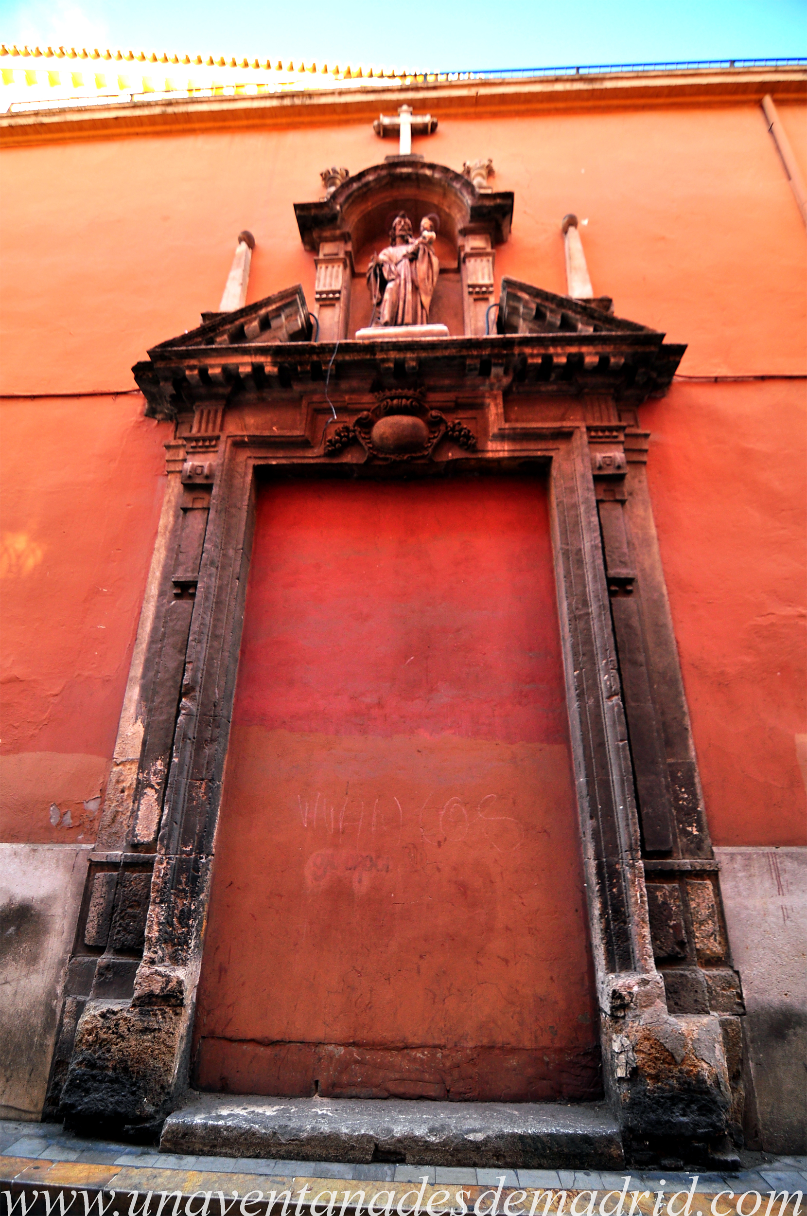 La portada de acceso a la iglesia, adintelada20, apoyada en pilastras y rematada por un frontón22 recto, se abre en la nave de la Epístola23 y, para llegar a ella, hay que atravesar un pequeño compás25 al que se accede, desde la calle, por la portada rematada con un frontón curvo que da a la calle San Vicente.