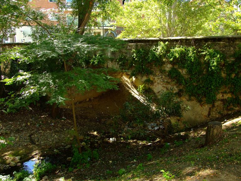 Seguimos andando y vemos cómo la muralla desaparece para volver a verla unos metros más adelante cambiando su dirección hacia el Sur, aumentando asimismo de altura. Si seguimos más al Sur aún, veremos restos originales de muralla. El tramo que hay al Suroeste sigue elevándose sobre el arroyo y, junto a la Calle de los Molinos, aún es posible ver la base de dos torres. En la parte Oeste, la muralla ha desaparecido en su totalidad, pero diversos investigadores creen que su trazado coincidiría con la ruta que une el anterior ángulo del Suroeste con los siguientes vestigios que encontramos, los de la cerca que encierra la huerta de la Cartuja.