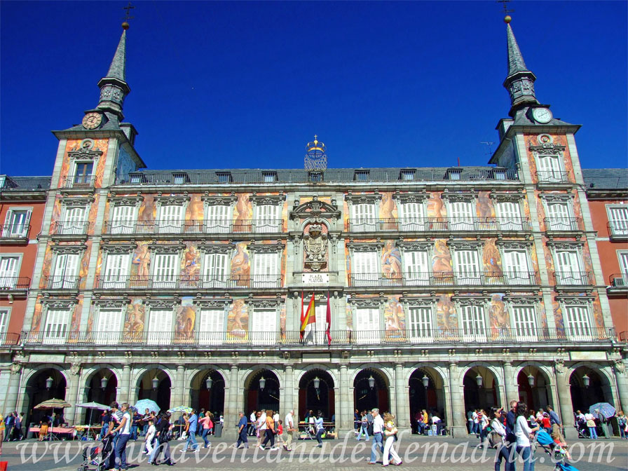El edificio es de planta cuadrada, presenta exteriormente cuatro alturas (planta baja y tres superiores) y está cubierto por un tejado a dos aguas8 en el que se abren ocho mansardas9 a la Plaza Mayor y otras tres en su parte posterior. En su fachada, recorrida por once ejes verticales de huecos apoyados sobre igual número de soportales realizados con arcos de medio punto10 situados entre columna, destacan los dos torreones cuadrados (con una altura más) y cubiertos por chapiteles11 de las esquinas, el gran escudo real situado sobre los vanos12 de la segunda y tercera planta de su eje central, y las pinturas que la decoran, realizadas en 1992 por Carlos Franco.
