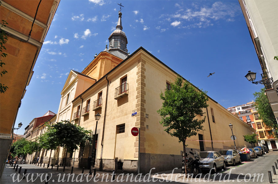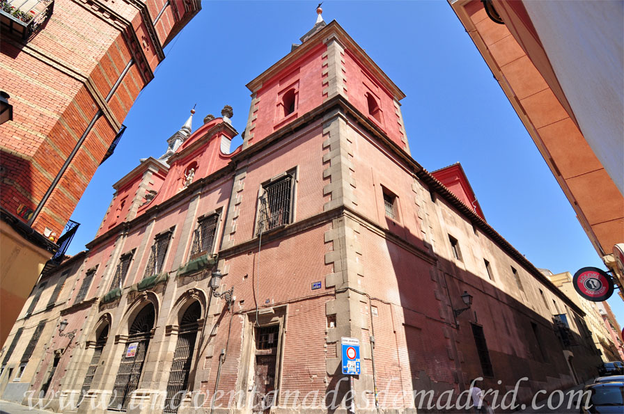 Al lado de la fachada de la Iglesia, se halla el convento, con muros de ladrillo y mampostería que se alzan sobre una base de granito. Cuenta con dos alturas, si bien en algunos lados hay partes abuhardilladas, además de unos pequeños torreones de ladrillos y rejas de madera. Destaca poderosamente su sobriedad, pues, salvo las ventanas adinteladas cerradas con rejas de forja, carece totalmente de ornamentación. Una placa de mármol hecha por el escultor Ponciano Ponzano y situada en la parte inferior nos permite leer una inscripción en la que dice: "A MIGUEL DE CERVANTES SAAVEDRA, QUE POR SU ÚLTIMA VOLUNTAD, YACE EN ESTE CONVENTO DE LA ORDEN TRINITARIA, A LA CUAL DEBIÓ PRINCIPALMENTE SU RESCATE: LA ACADEMIA ESPAÑOLA. CERVANTES NACIÓ EN 1547 Y FALLECIÓ EN 1616".