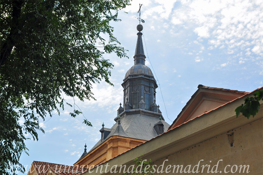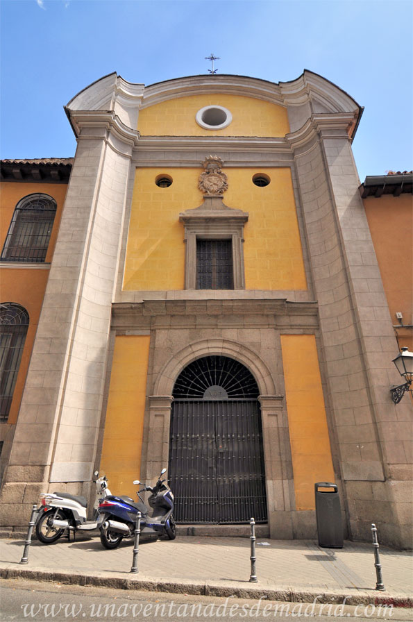 Si pasamos a su descripción, debemos decir que estamos ante una joya del barroco madrileño. El exterior de la Iglesia nos muestra una gran fachada cóncava73 de granito y revoco, con una planta ligeramente curva. Se halla dividida en dos cuerpos, además del ático. En el primero, se abre la puerta que da acceso al atrio, un arco de medio punto que asienta sobre pilastras y que se cierra con una reja del siglo XVII en la que se pueden leer las siglas V.O.T. Sobre ella, en el segundo cuerpo y separada por una moldura, hay una ventana adintelada, también cerrada con rejería, que da luz al coro y que queda rematada por el escudo franciscano flanqueado con sendos óculos74 laterales. El ático es un frontón75 curvo con un gran óculo en el centro. Corona la fachada una cruz de forja. Una espadaña se alza en el lado del Evangelio76, la cual se compone de dos vanos para las campanas cerrados con rejas, estando rematada por un frontón. También cabe señalar la cubrición de la cúpula, estando ésta formada por un tejado de pizarra a cuatro aguas con pinchos en los que había la costumbre, en las iglesias de Madrid, de colocar velas para los grandes actos, dando así la sensación de mayor iluminación y festividad; la cúpula queda coronada por una linterna, igualmente de pizarra, y una cruz de forja.