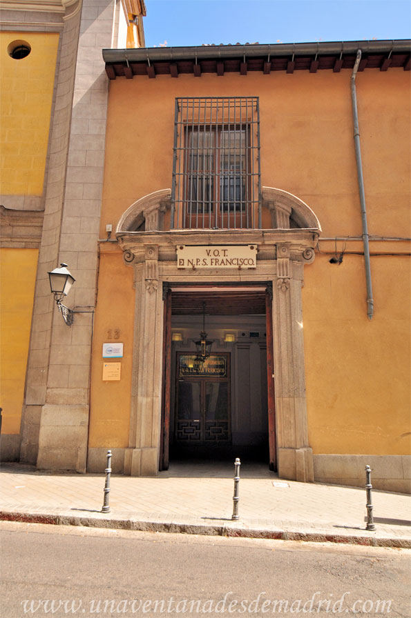 El acceso a la capilla se suele hacer, normalmente, a través del hospital, mediante una puerta adintelada y moldurada, coronada con un frontón curvo partido sobre el que se abre una ventana rectangular cerrada con rejería. Es entonces cuando se puede contemplar la magnífica escalera, construida en el año 1683 por los hermanos Ramón y Marcos López. Está compuesta por dos rampas que van a parar a una mesa, saliendo de ahí otras dos hacia la parte superior; todo ello se apoya en arcos rampantes77 sustentados por pilares dobles. También es digna de mención la bóveda, pintada por Teodoro Ardemans, la cual presenta los escudos de la orden franciscana y de la V.O.T. Asimismo, en el recorrido de la escalera se pueden admirar distintas obras de arte de autores como Carreño de Miranda, o Van Dyck, entre otros.