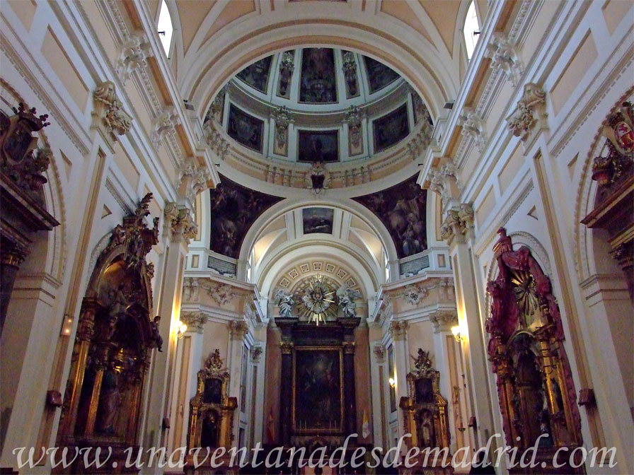 Una vez dentro, veremos una serie de arcos laterales de medio punto que sirven para acoger altares. La decoración interior en las bóvedas es obra de los hermanos Luis, Alejandro y Antonio González Velázquez. De entre todo lo que se podría destacar de ella, haremos hincapié en el Retablo Mayor. En él, el pintor Gregorio Ferro representó la Adoración de la Eucaristía por San Benito y San Bernardo; la obra está enmarcada por un retablo neoclásico con dos columnas de orden compuesto37, mientras que la remata un rompimiento de gloria, donde dos ángeles hechos de estuco57 se hallan alrededor del Espíritu Santo.