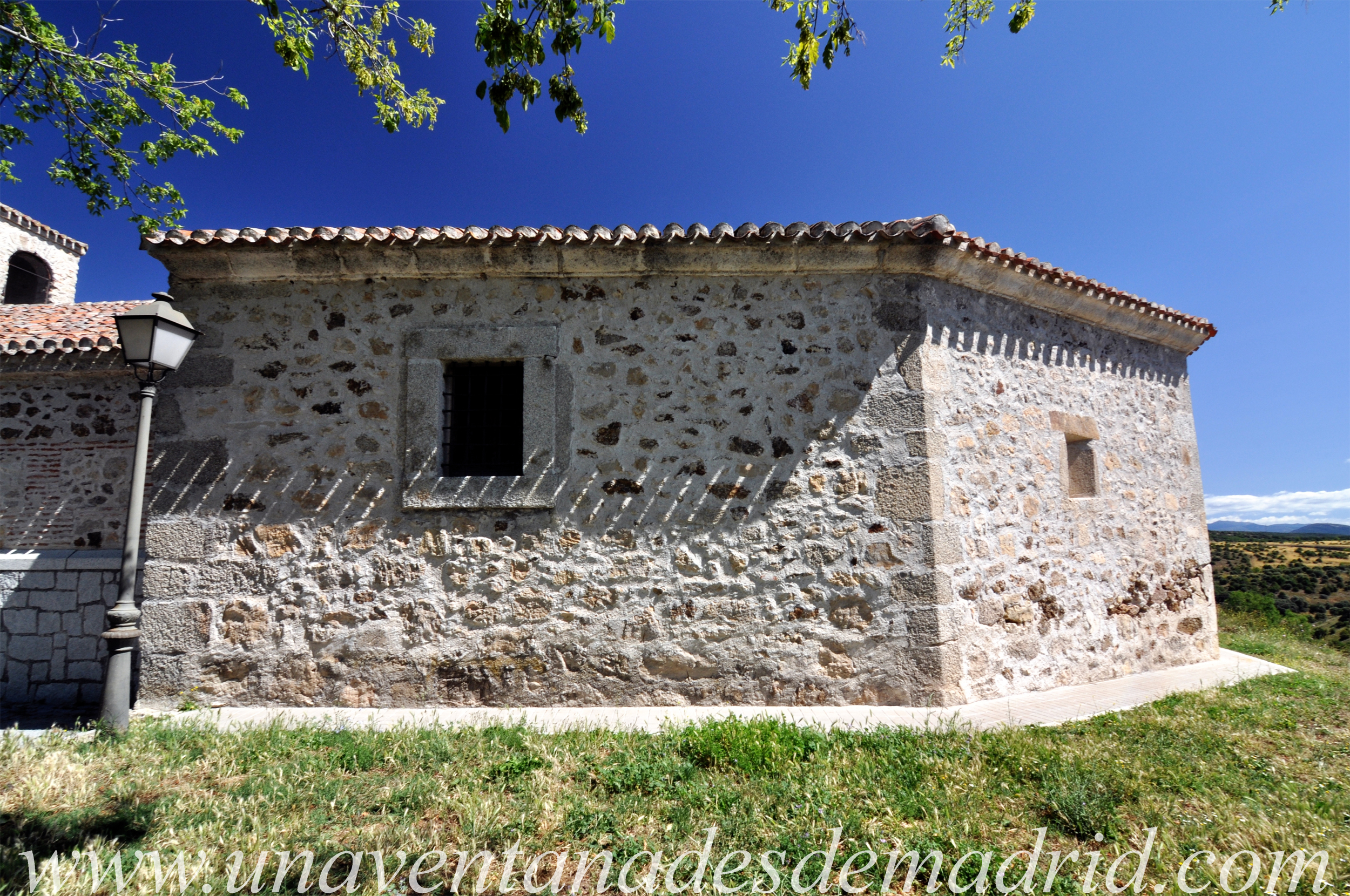 Este templo, estilísticamente del siglo XVII, tiene los muros levantados de mampostería55 con sillares57 de granito reforzando las esquinas, los dinteles61 y las jambas de la puerta de acceso, y las ventanas. En el paramento de la Epístola (el Sur)63, se observan varios tramos de aparejo65 a la toledana66.