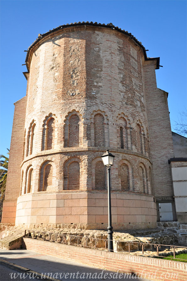 Como ya hemos comentado casi al inicio de este artículo, el ábside es el elemento más característico del templo. Realizado con ladrillo en estilo mudéjar, tiene planta poligonal y en él se pueden distinguir dos épocas distintas. Por una parte, la parte baja es el único resto conservado de la primitiva iglesia y se trata de un basamento semicircular hecho de mampostería en el que hay dibujados once caras; sobre éste, hay superpuestas dos bandas de arcos ciegos doblados, siendo los de la banda inferior de medio punto y los de la superior lobulados37 con herraduras40 túmidas41. Por otra parte, la zona superior, construida en la etapa final del gótico, es decir, a finales del siglo XV o comienzos del XVI, es lisa y está hecha de ladrillo y mampostería. El ábside cuenta, además, a ambos lados, con sendos contrafuertes de ladrillo.