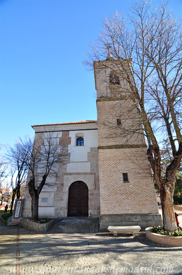Llegada la segunda mitad del siglo XX, en 1970, se lleva a cabo una restauración del templo que se centrará principalmente en su artesonado15 y que será ejecutada por Fernando Chueca Goitia y José Miguel Merino de Cáceres, arquitectos de la Dirección General de Bellas Artes. Dos décadas después, entre 1989 y 1993, sería nuevamente restaurado, esta vez por los igualmente arquitectos Manuel e Ignacio de las Casas Gómez y siguiendo el encargo de la Consejería de Cultura de la Comunidad de Madrid. En esta ocasión, la restauración se llevaría a cabo en dos fases. La primera se proyectó en 1990 y acabó al año siguiente; ésta se centró en la torre (reparándose el chapitel18, protegiéndose sus fábricas, cornisas y jambas19 y recuperándose las sujeciones de las campanas y el pararrayos), la escalera del coro (en muy mal estado) y el ábside (saneándose la parte baja de los muros por las humedades que presentaba y reparándose las grietas de los paramentos y los tirantes21 de las cubiertas). La segunda fase sería proyectada en 1992, momento en que, entre otras actuaciones, se sustituyó la parte externa del basamento de mampostería del ábside por un muro de hormigón con la misma altura que el zócalo original, se redujo la altura de la sacristía y se realizó el acceso al coro por medio de una escalera de caracol que se situó en el interior del cuerpo inferior de la torre.