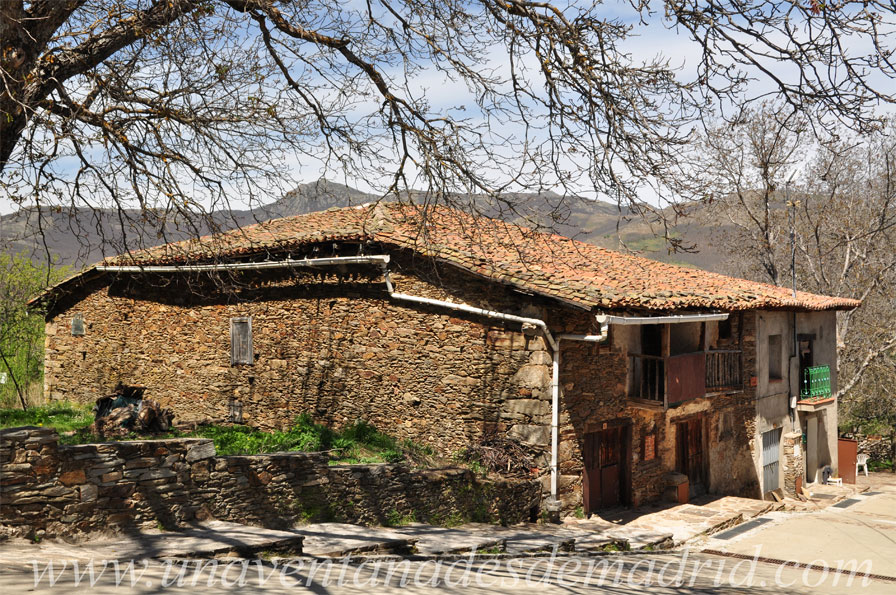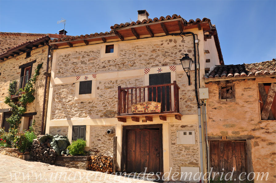 Son varios los ejemplos de viviendas rurales que podemos encontrar en el municipio, pues él en sí mismo ha conservado la esencia arquitectónica de un pueblo rural. Estas casas fueron realizadas, prácticamente en su totalidad, con materiales tradicionales de esta zona de la región madrileña, trabajándolos de manera artesanal y adaptándolos a la sencillez de la construcción, así como al clima y a la orografía del terreno, algo nada fácil. Su estructura se ejecutaba con gruesos muros de carga de mampostería de granito, con remates de sillarejo21 y piezas mayores en las esquinas, entre los cuales se intercalan lajas22 de pizarra, todo ello unido con mortero23 constituido básicamente de barro. La mayoría de estas casas dejaron sus fachadas con piedra vista, aunque algunas eran enfoscadas24 con barro y, en ocasiones, incluso se encalaban25 con cal en tonos ocres. Los huecos de puertas y ventanas son de pequeño tamaño cuando se abren en fachadas orientadas hacia el Norte y mayores cuando están en las orientadas al Sur, con el fin de hacer frente al duro clima.