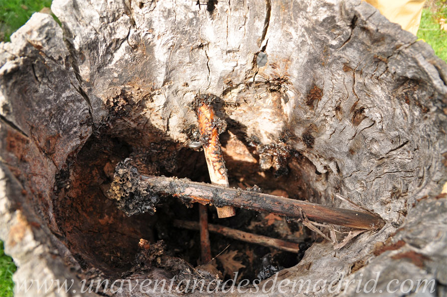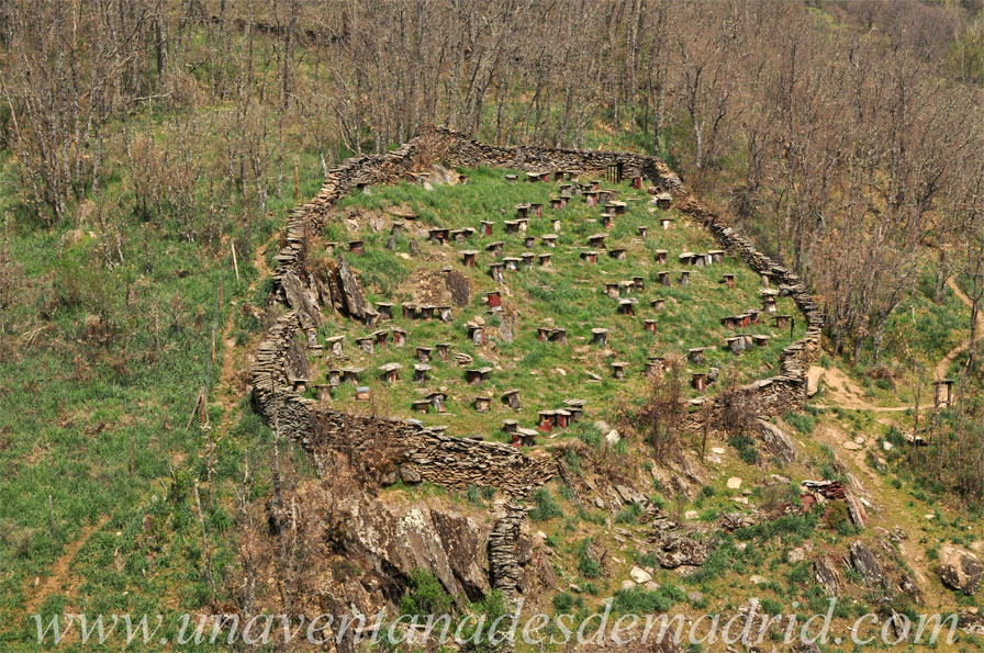El Colmenar tradicional de La Hiruela, situado en el Paraje “Prado Viejo”, tiene más de 300 años de antigüedad y estuvo en funcionamiento hasta el año 1980. Se encuentra situado en un terreno de propiedad privada que era compartido por cinco familias, las cuales, dedicadas a la apicultura32, marcaban aquí los troncos de que eran dueñas, conservándose aún algunas de estas marcas en los más de 100 troncos utilizados como colmenas. Se trata de los “corchos”, como se denominan estas secciones de tronco de roble y cerezo cuyo interior era ahuecado y atravesado por palos (viros) en los que las abejas cuelgan (estiran) sus panales de cera. Al prensar este panal, se obtenía la preciada miel, pero a la par se destruía, con lo que no era posible reutilizarlo, resultando la miel más cara que en las colmenas modernas. En cambio, la miel de entonces tenía más aroma, sabor y mayor contenido de polen que la lograda hoy por procedimientos actuales. Los antiguos apicultores usaban unas caretas hechas por ellos mismos con alambre y paño blanco para cortar los panales con una espátula (tajadera). La miel podía, además, ser empleada como moneda con la que realizar trueques33 por otros alimentos.