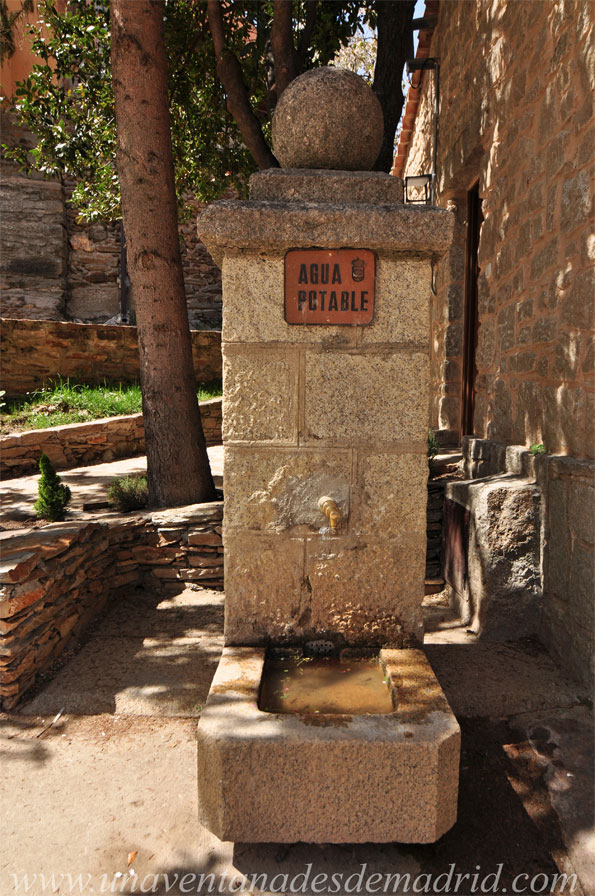 Por un lado, la Fuente está formada por un muro de mampostería, recto en la zona central y curvo hacia los laterales, dividido en dos por un pilar de sillares y flanqueado, a su vez, por otros dos pilares también de sillares, quedando los tres rematados por una estructura escalonada coronada con sendas bolas. En la parte inferior del pilar central, se sitúa una pila que, al igual que la anterior, tiene sus esquinas achaflanadas, quedando alzada sobre el nivel del suelo por un pie no demasiado alto. Sobre el único caño con que cuenta, una placa reza “DIPUTACIÓN PROVINCIAL / DE MADRID / AÑO 1958”. A ambos lados de la pila y adosados igualmente al muro, hay instalados dos bancos también de piedra.