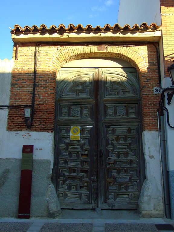 Unos metros más adelante por la Calle Libertad tenemos la Casa de la Cultura de Navalcarnero, instalada en el edificio que vemos en la fotografía, una casa solariega que hace siglos era vivienda de los Delgado, familia que procedía del valle de Toranzo, en Cantabria. Según las fuentes, en el año 1753 pertenecía a Don Rafael Manuel Delgado y se había convertido en una de las casas más importantes de la villa ya que, además de la vivienda, contaba con un lagar21, una bodega y una cueva. Sobre la portada, vemos un escudo que nos indica el superior nivel social de quienes habitaban en ella. En él, el casco simboliza el carácter hidalgo22 de la familia. Del interior, destaca el patio, en cuyo centro se erige una escultura de Feliciano Hernández.