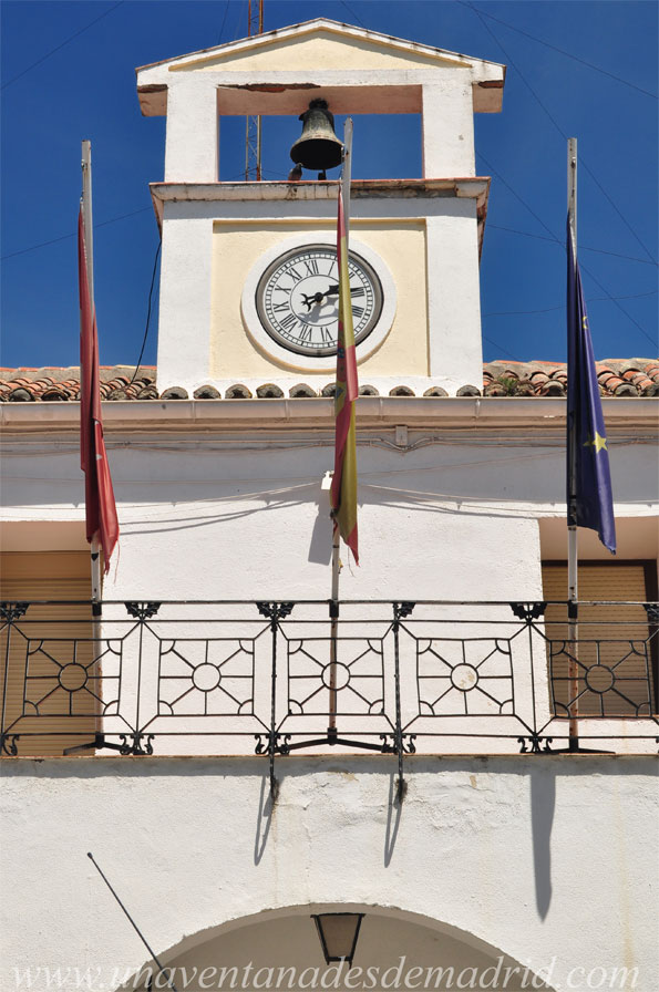 Nos hallamos frente a una edificación de tres cuerpos, uno central más alto y dos laterales, y de dos plantas entre medianeras45, del que destaca su frente, abierto hacia la plaza por medio de un porche de acceso que remata un gran balcón cerrado con barandilla de hierro. Todas las fachadas están enfoscadas46 con yeso y cal. La cubierta, de teja curva, es a dos aguas en el cuerpo central y a tres en los cuerpos de los lados, formando en todos ellos un pequeño alero. El centro del cuerpo principal se encuentra rematado por un torreón en el que hay instalado un reloj y una pequeña campana.