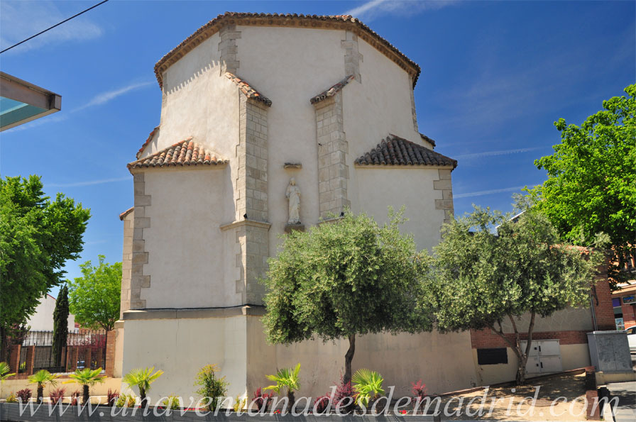 El resto del templo fue levantado en el siglo siguiente, por lo que tenía trazas barrocas, sin embargo, hoy presenta un aspecto totalmente distinto de cómo fue antaño, siendo esto debido a que el edificio fue restaurado casi por completo en los años 20 del pasado siglo XX, concretamente entre los años 1925 y 1926, obras llevadas a cabo con motivo del estado ruinoso en que se hallaban tanto las naves como la torre. Así, esta nueva construcción se ejecutó con muros de ladrillo y piedra, imitando cajones de mampostería toledana, materiales utilizados igualmente en la espadaña, que se alza en la fachada principal. El templo perdería su torre, con el chapitel32 que en su día construyera Bartolomé Hurtado, toda la nave junto con las capillas y el pórtico, quedando, pues, en pie solamente el ábside.
