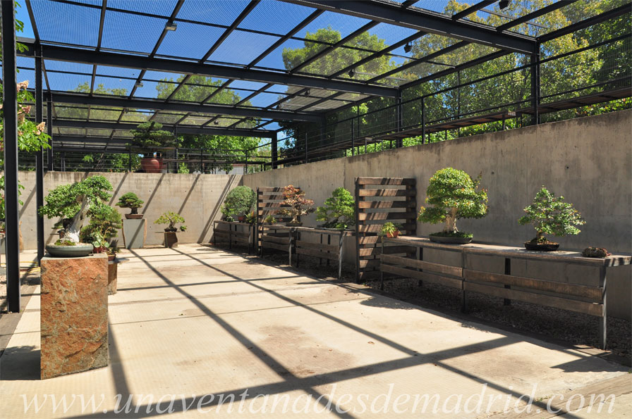 La zona de exposición, de 600 m2 y dividida entre exposición permanente y temporal, está situada en un edificio cuyos espacios expositivos disponen de las necesarias condiciones para asegurar el adecuado desarrollo de los bonsáis allí existentes. Estos árboles están situados sobre mesas de madera o sobre pedestales realizados con materiales naturales, para permitir así su movilidad conforme a las condiciones ambientales y a sus propias características.