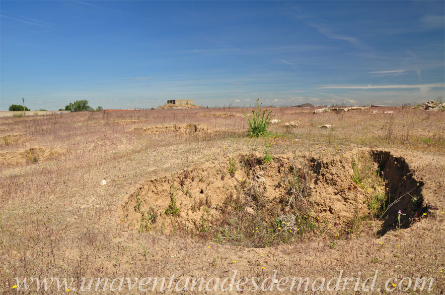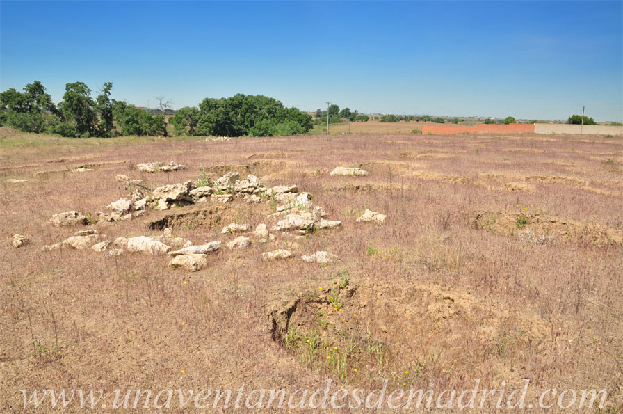 Yacimiento del Cerro de la Iglesia; al fondo, donde la vegetación, se encuentra el arroyo de Humanejos.
