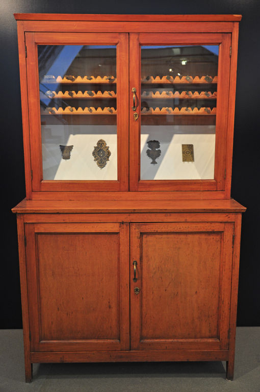 Además de para "montar" el libro, dentro del proceso de encuadernación también está la parte del embellecimiento de las cubiertas. Aquí, una de las técnicas más utilizadas es el dorado, ligado al mundo de la encuadernación desde el siglo XVI y hasta entrado el siglo XX. Para su realización se necesita una serie de herramientas especiales, como hierros, paletas, planchas, ruedas, etc. con las que llevar a cabo las más diversas formas ornamentales en función de la moda imperante según el estilo decorativo de cada época. De este modo, uno de los elementos imprescindibles en todo taller de dorado es el que vemos aquí: el armario con los hierros, propiedad que fue de Antolín Palomino Olalla, uno de los grandes encuadernadores del siglo XX en España, donde veremos una selección de piezas con distintos motivos, entre ellas, una con el escudo de Madrid.