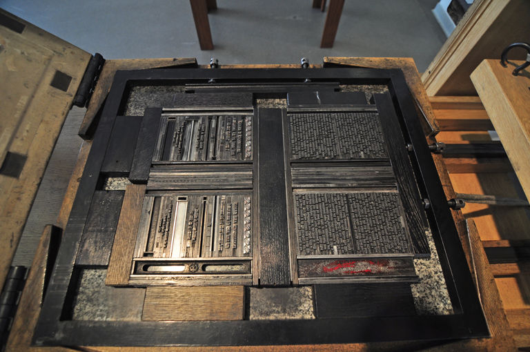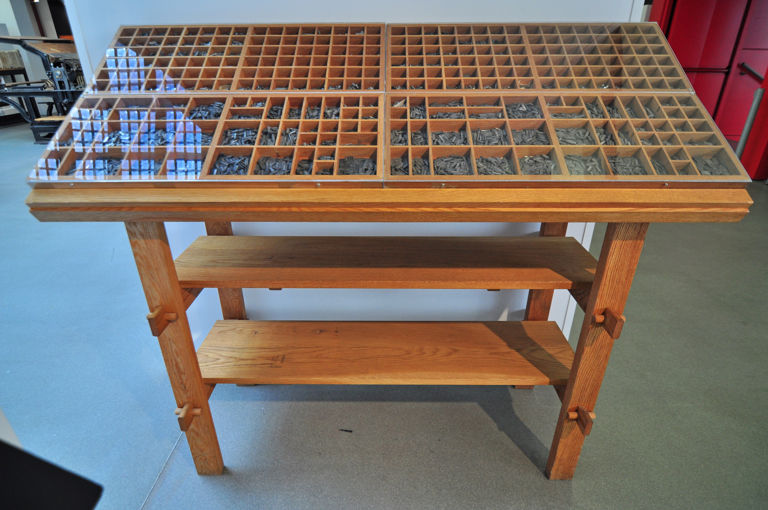 Una muestra del trabajo del tipógrafo la tenemos aquí en una reproducción de un chibalete basada en un modelo de los usados entre los siglos XVII y XVIII. Vemos que se trata de una mesa cuyo tablero es inclinado con el fin de sustentar mejor las cajas donde se almacenan los tipos. Para facilitar el trabajo, arriba se pone la caja alta, que guarda las mayúsculas, mientras que en la parte inferior va la caja baja, donde van las minúsculas, los signos y los espacios. Dependiendo del idioma para el que se destinaba el chibalete, los tipos se disponían de una u otra forma, en función de la mayor o menor cantidad de letras utilizadas.