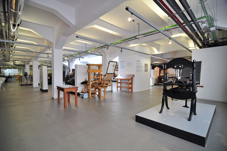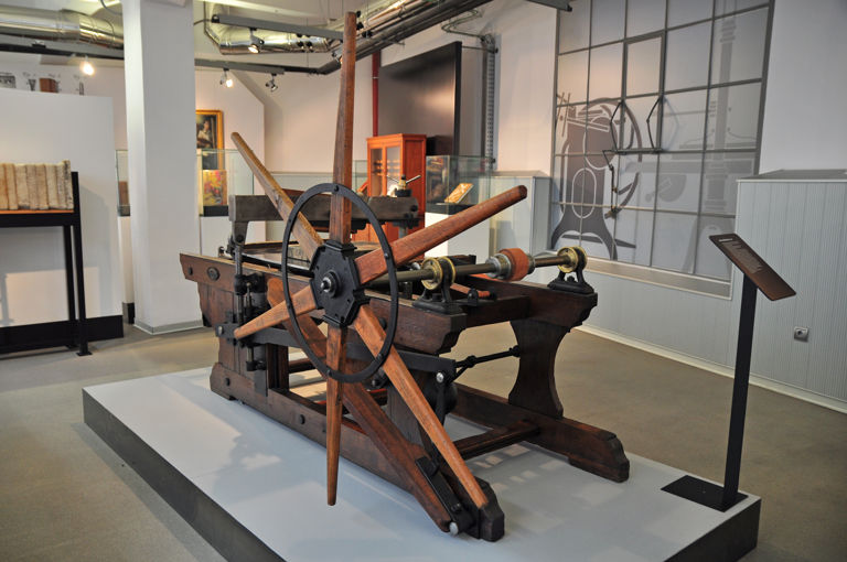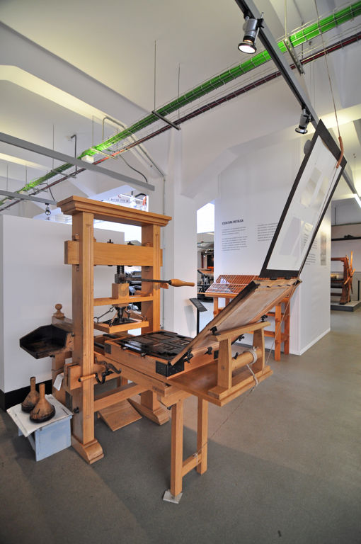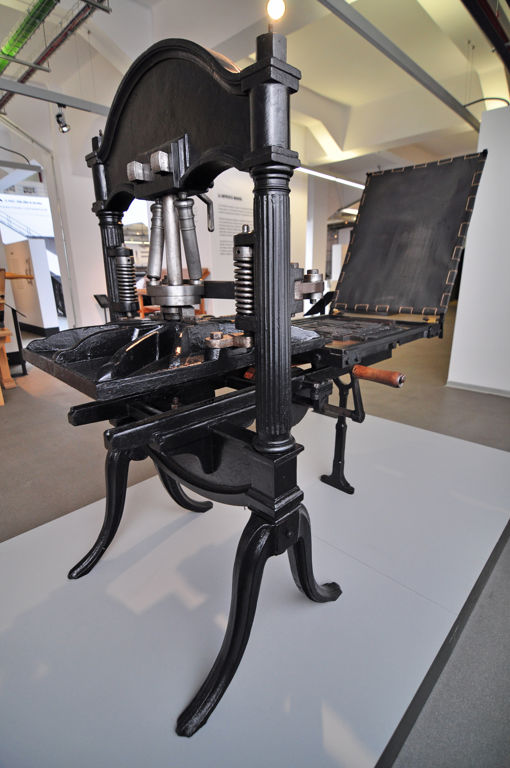 Así, como ya comentábamos antes, a mediados del siglo XV Johannes Gutenberg crea en Alemania un procedimiento basado en tipos, una serie de letras hechas en plomo que, al unirlas, formaban los textos deseados. Surge de este modo la tipografía, o escritura con tipos móviles. Esto obligaría a la fabricación de una nueva prensa con la que utilizar esas piezas y realizar las copias, máquinas que, a lo largo del tiempo, irían evolucionando hasta el siglo XIX, tal y como podremos ir viendo en esta sala.