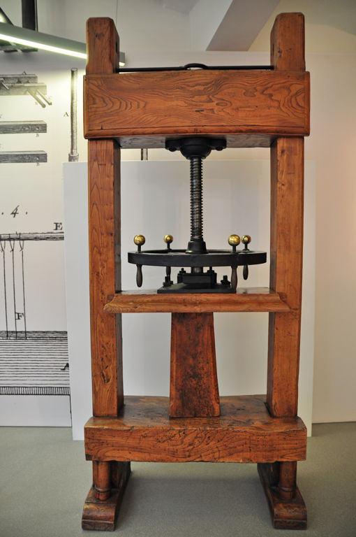 Reproducción de una prensa de imprimir realizada según los modelos utilizados entre los siglos XVI y XVIII.