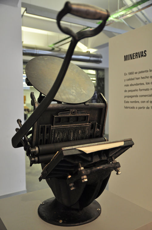 El otro ejemplar de Minerva que podemos observar en el edificio es la Minerva de pedal de 1940, un modelo en el que ha desaparecido la palanca y su funcionamiento se realiza mediante un pedal con el que se acciona una rueda de inercia que asegura un movimiento continuo. Esta máquina es un ejemplo del desarrollo de este tipo de prensas a lo largo de los años, durante los cuales se construyeron de diferentes tamaños y sistemas de entintado, así como de distintas formas de funcionamiento, incluyendo, desde principios del siglo XX, las que salían de fábrica dotadas con motor eléctrico. Igualmente, existió la tendencia a modificar aquellas que no lo tenían dotándolas de este tipo de motor.