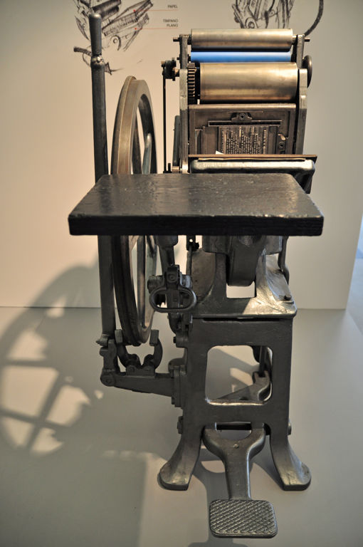 Veamos a continuación las dos prensas de impresión plano-cilíndricas expuestas en la Imprenta Municipal. Su invención supuso la adopción de una nueva forma en la impresión, cuya disposición general se ha mantenido hasta la actualidad. Se trata de la sustitución del antiguo tímpano plano por otro de forma cilíndrica que presionaba al papel sobre la forma tipográfica a una mayor velocidad, mientras que ésta última se entintaba a la par. Estas prensas rápidas, llamadas máquinas en España, tuvieron un posterior desarrollo que les dio la posibilidad de imprimir en varios colores y alimentarse automáticamente de papel.