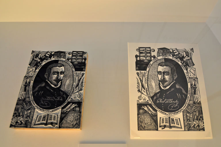 Colgando de uno de los paneles, encontramos también un óleo pintado en 1964 por A. Narvarte en el que están representados Palomino y el también encuadernador Emilio Brugalla en el taller que el primero tenía en Madrid, lugar del que procede el equipamiento de máquinas manuales que poseía y que hoy se encuentra aquí en la Imprenta Municipal. Precisamente de ellos dos son algunas de las obras expuestas en las vitrinas de esta parte de la sala, junto con otras de artistas como Gregorio del Peso Redondo, Antonio Díaz Montero, o Vicente Cogollor Mingo.