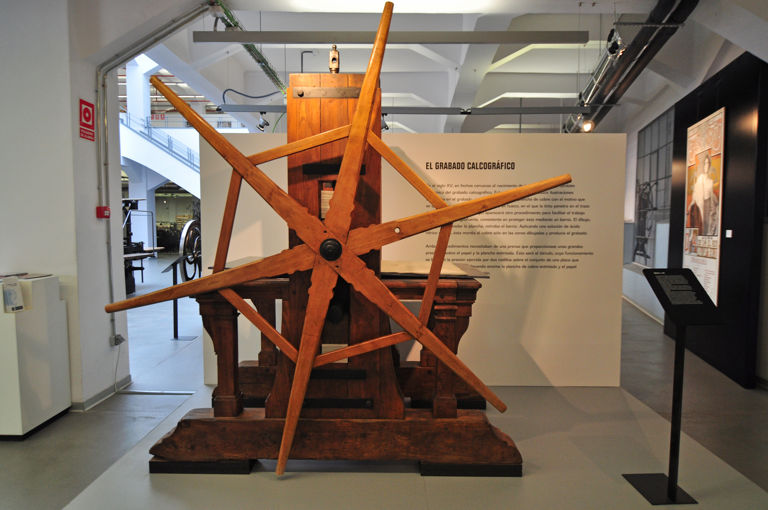 El grabado en hueco sobre plancha metálica, o calcografía, se ha venido utilizando desde el siglo XV. Con él, las imágenes que previamente habían sido grabadas en hueco sobre planchas de cobre eran impresas sobre papel, utilizando para ello tórculos, u otro tipo de prensas, algo que ya hemos visto al inicio de nuestro recorrido por la exposición. La gran presión ejercida por estos últimos hacía que la vida útil de las planchas no fuera muy extendida por lo que el número de impresiones no era demasiado grande.