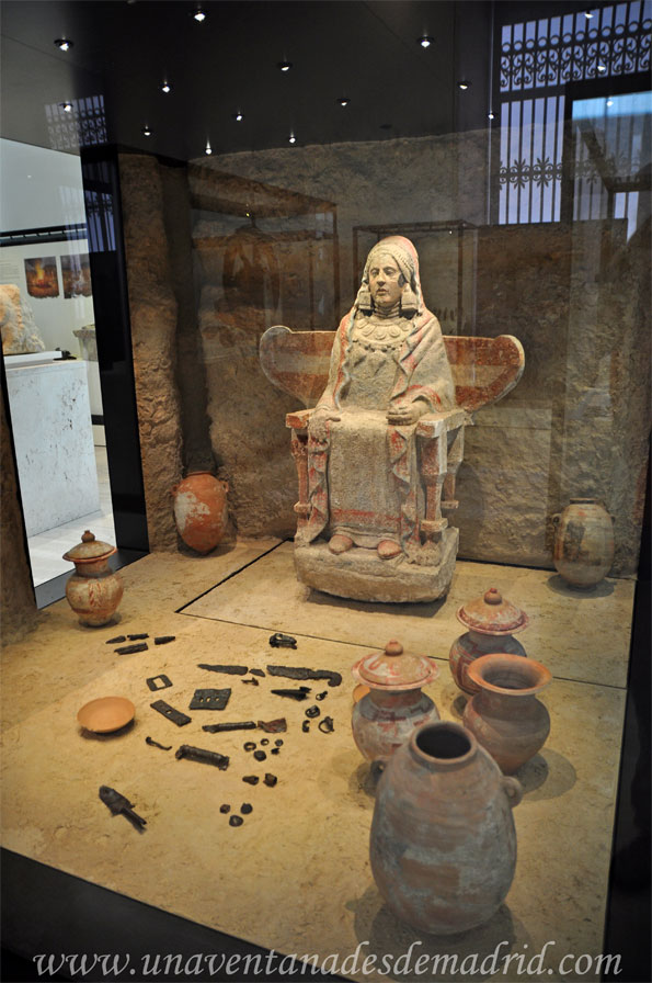 En la sala, entre otros elementos, podemos contemplar expuestos los tesoros de Jávea (Alicante), de La Puebla de los Infantes (Sevilla), de la Torre de Juan Abad (Ciudad Real) y de Perotito en Santisteban del Puerto (Jaén); varias maquetas de fortificaciones; armamento; la rueda del carro de Toya y una maqueta de esta impresionante tumba real; esculturas procedentes de necrópolis ibéricas; joyas y exvotos19 que formaban parte de los ajuares de las tumbas; y las dos esculturas mostradas en las fotografías adjuntas, correspondientes a la Dama de Baza y a la Dama de Galera.