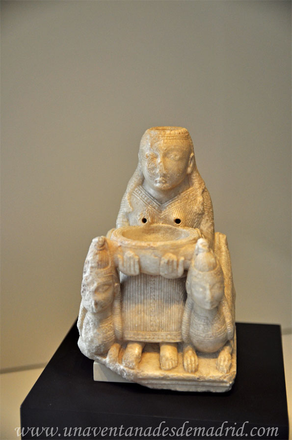 Dama de Galera. Se trata de una escultura de alabastro del siglo VIII a. C. que representa a la diosa fenicia Astarté y que fue hallada en una tumba ibérica del siglo V a.C. de la necrópolos de la antigua ciudad íbera de Tútugi (Galera), en Granada. El interior de la cabeza es hueco y por él se vertería el líquido (leche o perfume) utilizado en la libación que posteriormente, una vez sacralizado al pasar por el interior del cuerpo de astarté, saldría por los huecos que la figura tiene en sus pechos. Quizás éstos estarían cubiertos con una capa de cera que por el calor se derretiría, dejando pasar el líquido interior hasta llenar el cuenco que la escultura tiene sobre su regazo.