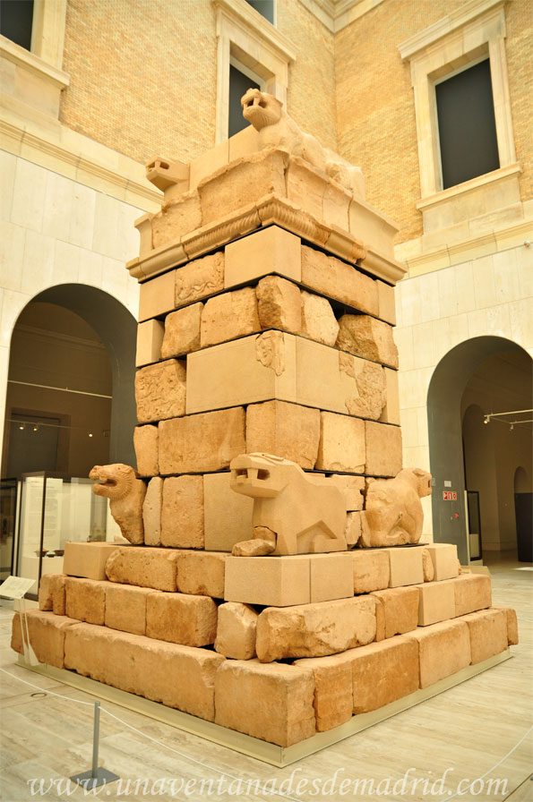La torre, de base escalonada, dos cuerpos de altura y relieves en sus paramentos23, vio aumentada su altura original al construirle posteriormente un remate. El monumento contaba con leones, un símbolo de realeza y de poder, así como de la protección que la divinidad otorgaba al difunto, situados en cada esquina de la línea de arranque de ambos cuerpos.