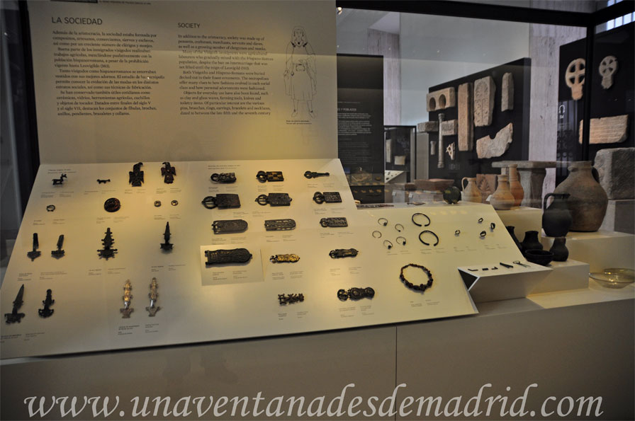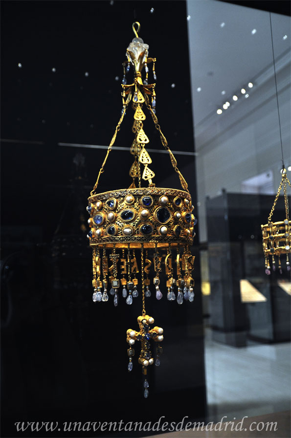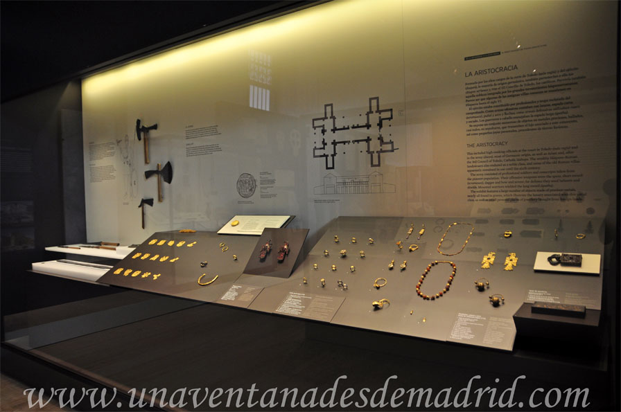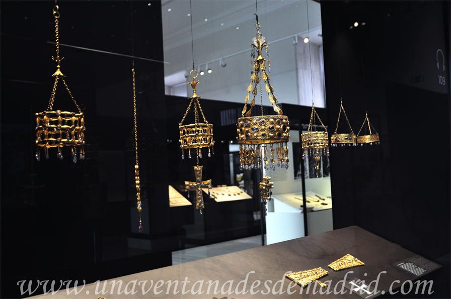 Entre el gran número de objetos expuestos en este espacio de la sala destaca el Tesoro visigodo de Guarrazar, datado en el siglo VII, que fue hallado, entre 1858 y 1861, en el yacimiento de Guarrazar, situado en Guadamur, Toledo. Está formado por seis coronas y cinco cruces, entre las que destaca, dado su tamaño y ornamentación, la corona de Recesvinto.