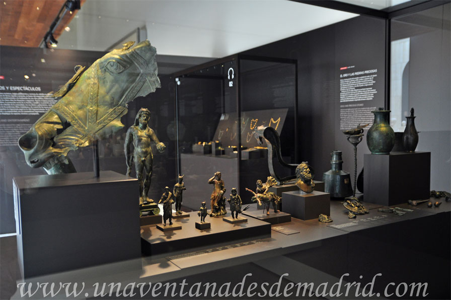 Finalmente, alcanzamos la última vitrina, pero no por ello la menos valiosa, ya que en ella se exponen diversas piezas de oro y piedras preciosas. La exhibición por parte de las mujeres hispanorromanas de sus joyas de oro y piedras preciosas constituía una señal distintiva de su posición social y de la familia de la cual formaban parte. Hay que tener presente que entonces el subsuelo hispano era rico en metales preciosos, ofreciendo a los orfebres, al igual que vimos antes con el bronce, la materia prima con la que realizar, en pequeños talleres volcados hacia el mercado doméstico, sus preciados trabajos. Otra importante pieza en el comercio de joyas la constituían los vendedores que iban hasta las casas con sus muestrarios de joyas, bien locales o bien llegadas desde Roma o Alejandría.