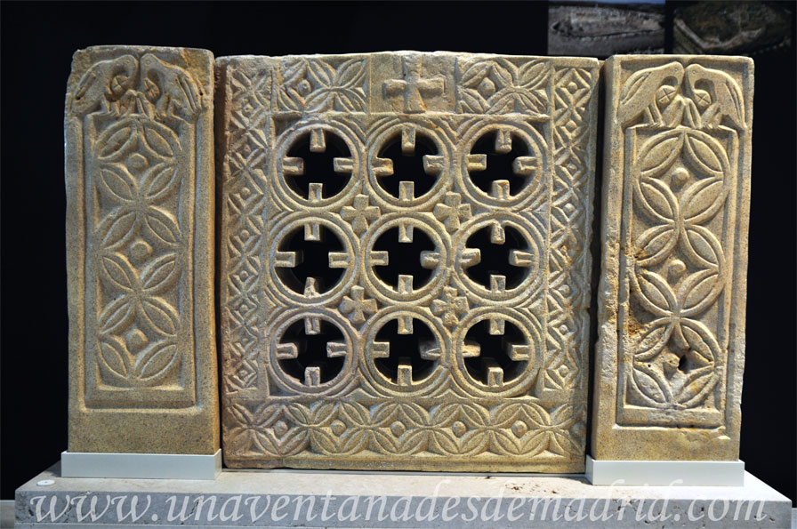 Reconstrucción con yeso de un cancel (reja, generalmente baja, que en una iglesia separa el presbiterio de la nave) de piedra caliza cuyos fragmentos fueron hallados en la ciudad visigoda de Recópolis. Siglo VI.