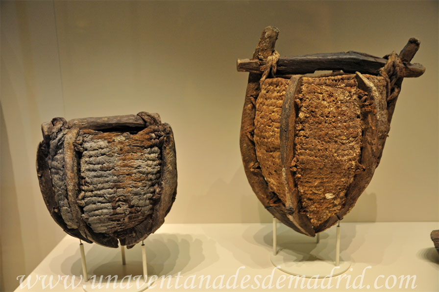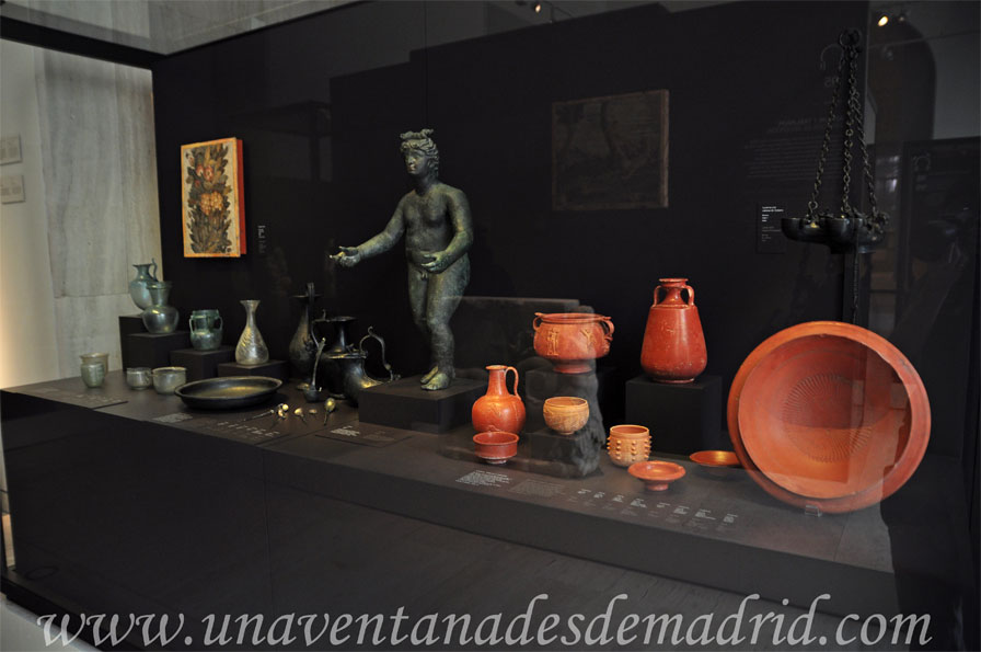 Por último, estaba la cocina, o culina, en la cual trabajaban los esclavos y las demás personas de servicio de la casa. Era una estancia pequeña, oscura y mal ventilada, ya que el humo sólo podía salir por un hueco que se abría en el tejado. En ella, el elemento principal era el hogar31, que contaba con una superficie plana en la que hacer fuego, así como con un espacio inferior en el que se guardaba la leña. A su lado, se situaba el horno, en el que se hacía el pan, y el fregadero. De las paredes colgaban estantes donde colocar utensilios y recipientes como los que se pueden ver en uno de los expositores, como por ejemplo morteros, marmitas de bronce y hierro, cuchillos, cazos, etc. En los rincones, o en pequeñas despensas, había ánforas con aceite y vino, tinajas con trigo y otros envases en los que se conservaban otros alimentos.