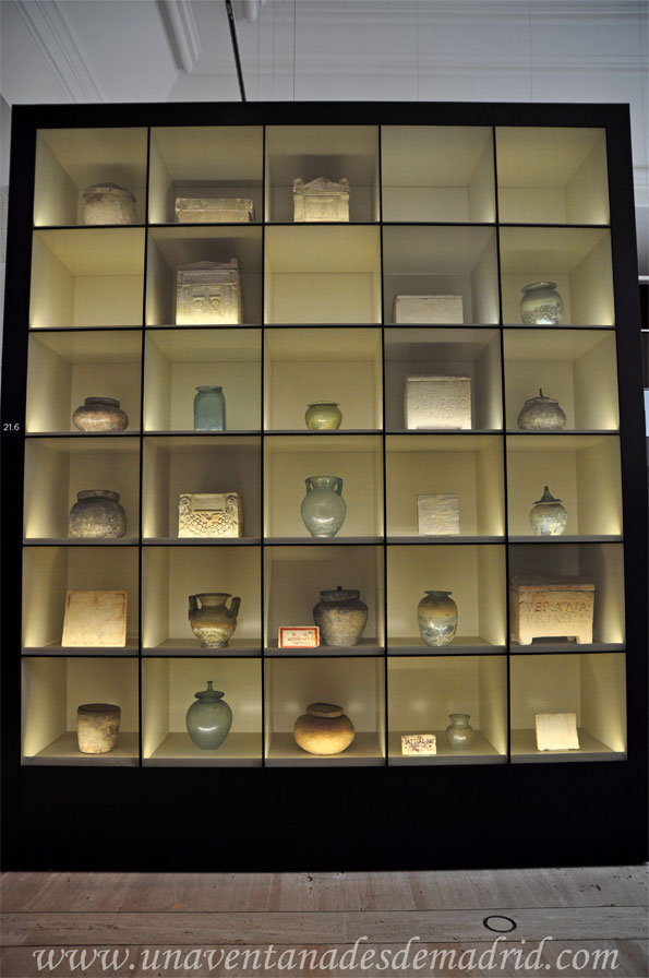 Sin embargo, otras familias eligen la cremación. Después del duelo, que tiene lugar en la casa, el cadáver es llevado en procesión hacia el cementerio, siendo allí colocado en la pira39 con un conjunto de ofrendas y de objetos personales rodeándole. A continuación, se dice su nombre en voz alta y se le abren por última vez los ojos. Cuando el fuego ha reducido su cuerpo a cenizas, éstas se recogen, se lavan con vino y se guardan en una urna. Las urnas, como las que se nos muestran en esta sala, acompañadas de placas con dedicatorias y con retratos de los difuntos, son colocadas en hileras superpuestas de hornacinas dentro de un pequeño edificio que recibe el nombre de columbario40 y del que podemos ver aquí una recreación.