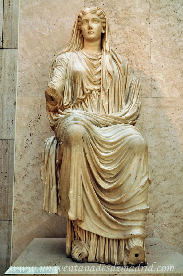 Varias son, como decimos, las esculturas, bustos y pedestales que podemos contemplar en esta sala. Pero de entre todos ellos, el museo señala como pieza destacada la Estatua de Livia, una escultura femenina que representa a la esposa del emperador Augusto, Livia Drusilla. Su apacible rostro mantiene una expresión idealizada, mientras que su cuerpo se viste con doble túnica y manto. Aquí aparece representada como una sacerdotisa. Y es que ella misma propició que su esposo fuera deificado18, dedicándole un templo y creando un colegio de sacerdotes, siendo ella misma sacerdotisa de su culto.