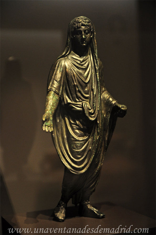 Estatuilla de bronce del siglo I d. C. con la figura de un hombre togado y cubierto con velo representando al pater familias.