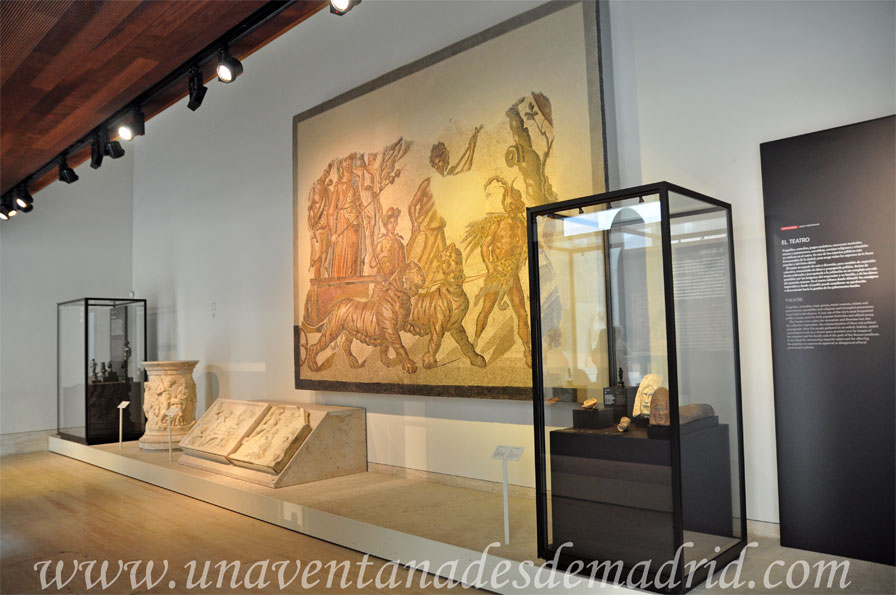 En el espacio dedicado al teatro, y entre otros objetos, destaca un gran mosaico dedicado a Baco, dios del vino, de la transformación y del teatro, que se presenta triunfador subido a un carro del que tiran dos tigresas. A la izquierda del anterior mosaico, se encuentra un ara (altar) dedicado igualmente a este dios y que al situarlo sobre el escenario de un teatro sacraliza este espacio, mientras que a la derecha hay una vitrina en donde observamos diversos elementos relacionados con el teatro, entre otros una máscara teatral y la pequeña figura en bronce de un actor.