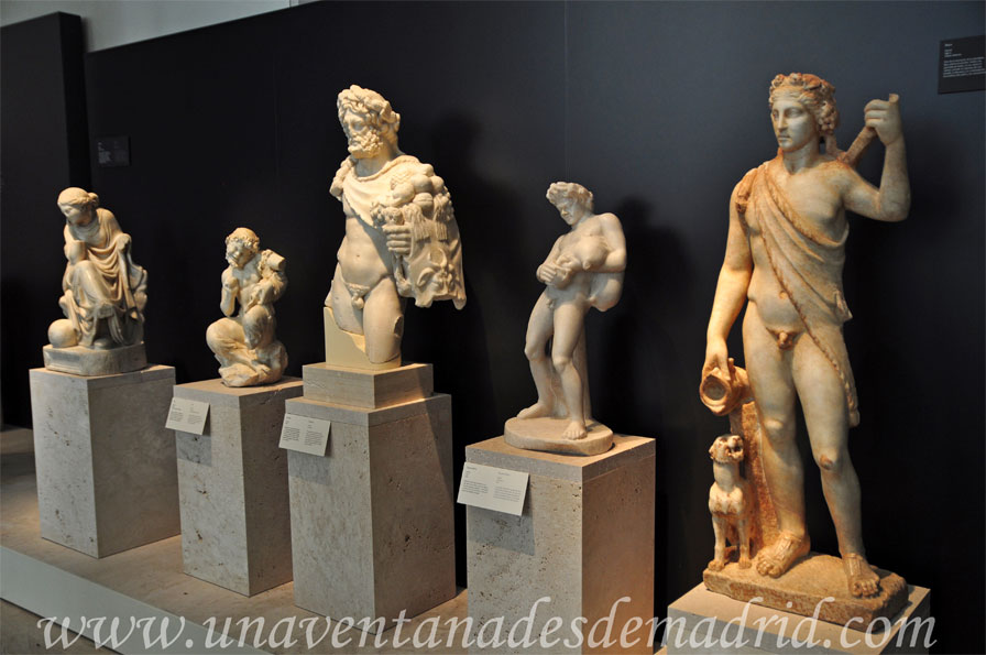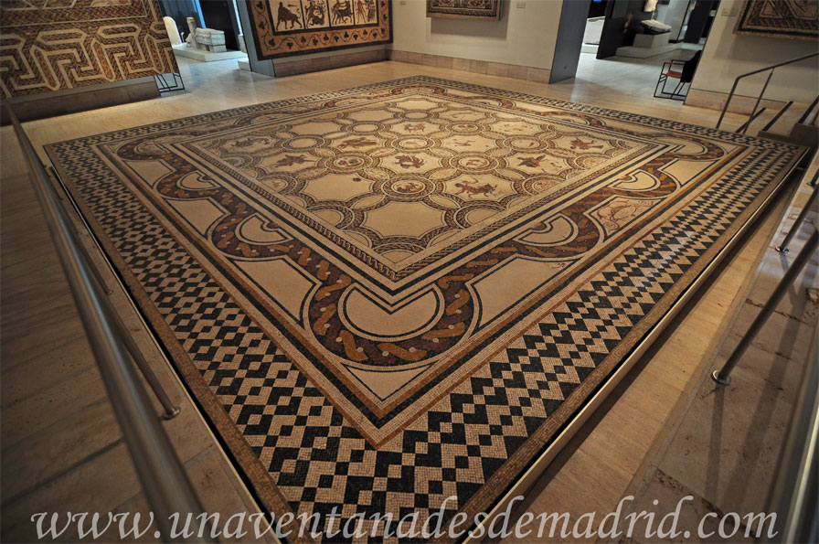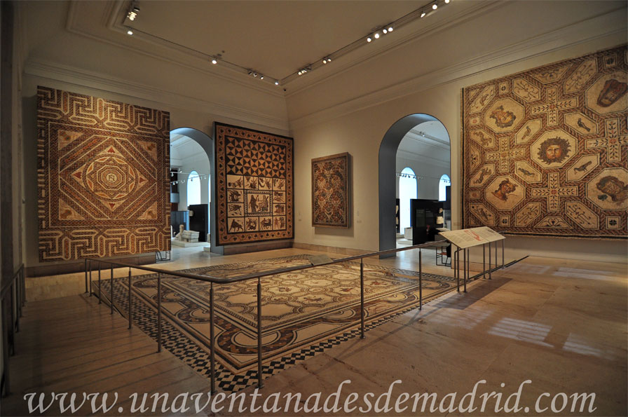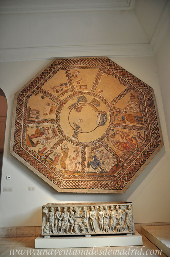 Presidiéndola, en el suelo, se encuentra el “Mosaico de las estaciones y los meses”, realizado en piedra caliza en el siglo III y hallado en Hellín (Albacete); en él, se muestran imágenes que representan, como su nombre indica, los meses y las estaciones del año por medio de escenas mitológicas, escenas bucólicas, dioses, signos del zodíaco y alusiones a fiestas; con ello, se alude a la celebración de la renovación de los ciclos de la naturaleza, la cual, bajo la tutela de los dioses, dará alimento y riqueza al señor de la villa.